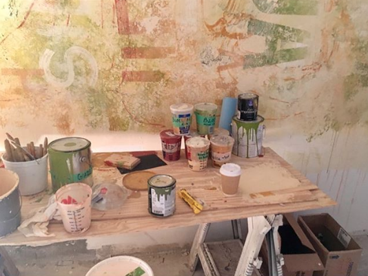 Together we plastered all of the interior walls in this large venue, layering custom hand-painted murals on top of the speciality plaster. Then I single-handedly painted 26 mirrors in five days; each one sign-written with menu items.